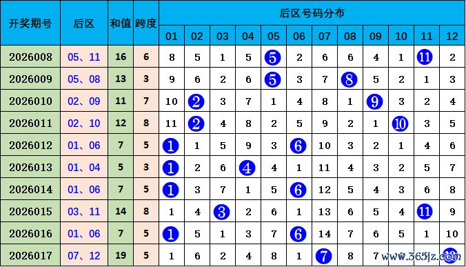 后区走势分析:上期开出07 12,开出和值19,较前一期和值上升12个点位变化,本期预测和值下降,参考号码03 06,和值9。